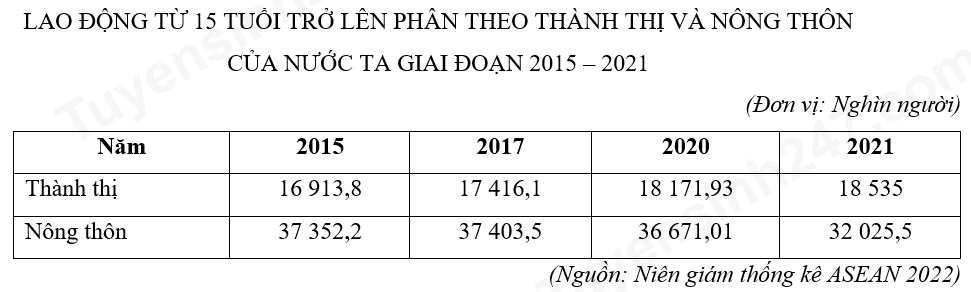 Dựa vào bảng số liệu, nhận xét nào sau đây đúng về đặc điểm của lao động từ 15 tuổi trở lên phân theo thành thị và nông thôn của nước ta giai đoạn 2015 – 2021?