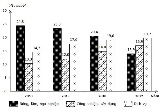 Cho biểu đồ:LAO ĐỘNG PHÂN THEO NGÀNH KINH TẾ CỦA NƯỚC TA GIAI ĐOẠN 2010 – 2022(Nguồn: Niên