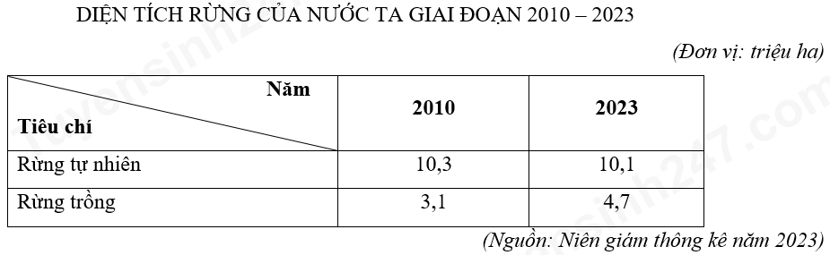 Cho bảng số liệu:Dựa vào bảng số liệu, hãy cho biết năm 2023 tỉ trọng diện tích rừng tự