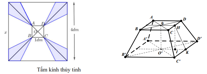Bạn An có một tấm kính thủy tinh hình vuông, cạnh bằng $4dm$, An muốn cắt ở bốn góc bốn tứ giác (được tô đậm như trong hình), sau đó gập lại để tạo thành một cái bể cá có dạng hình chóp cụt đều với đáy là hình vuông $ABCD$ có cạnh bằng $1dm$ và miệng bể là một hình vuông có cạnh bằng $x\left( {dm} \right)$. Hỏi $x$ bằng bao nhiêu decimet thì bể cá có thể tích lớn nhất? (kết quả làm tròn đến hàng phần trăm).