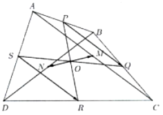 Cho tứ giác ABCD. Gọi P, Q, R, S lần lượt là trung điểm của các cạnh AB, BC, CD, DA. Gọi O là giao điểm của PQ, SR và M, N lần lượt là trung điểm của AC, BD. Chọn các khẳng định đúng: