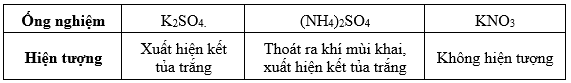 Nêu hiện tượng và viết phương trình hóa học xảy ra khi nhỏ dung dịch Ba(OH)2 lần lượt vào các ống nghiệm đựng các dung dịch: (NH4)2SO4, KNO3, K2SO4.