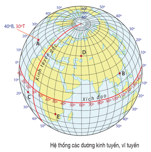 | a) Các địa điểm D, B, E đều nằm ở bán cầu Bắc. | ||
