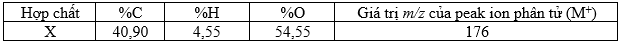 Vitamin C giúp tăng khả năng miễn dịch của cơ thể. Để xác định công thức phân tử của các hợp chất X trong vitamin C này, người ta đã tiến hành phân tích nguyên tố và đo phổ khối lượng. Kết quả khảo sát được trình bày trong bảng sau: