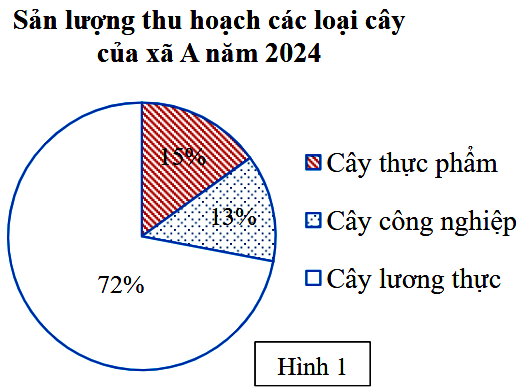 Biểu đồ hình quạt tròn (hình 1) cho biết sản lượng cây lương thực, cây công nghiệp, cây thực phẩm thu hoạch của xã $A$ năm 2024. Biết khối lượng cây lương thực xã $A$ năm 2024 là 10,8 tấn. Tính khối lượng cây thực phẩm, cây công nghiệp xã $A$ thu được năm 2024.