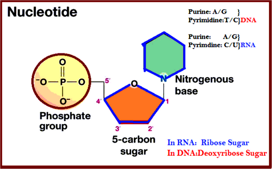 Mỗi nucleotide gồm 3 thành phần: gốc phosphate (–PO43-), đường deoxyribose (đường 5 carbon) và một nitrogenous base (base).