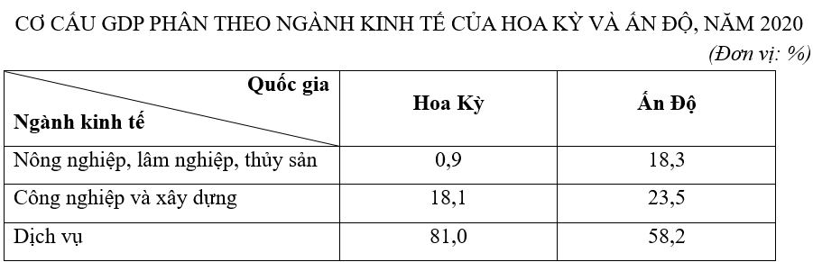 a, b, c) Dựa vào bảng số liệu và so sánh tỉ trọng các ngành kinh tế của Hoa Kỳ và Ấn Độ.