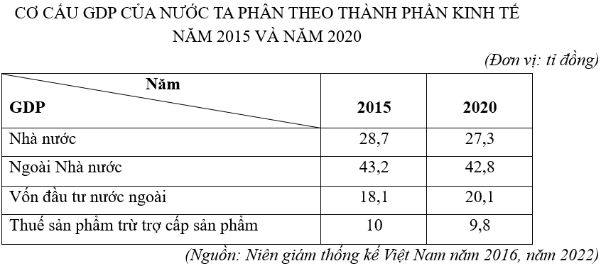 Dựa vào bảng số liệu trên, hãy nhận xét và giải thích sự thay đổi cơ cấu GDP phân theo thành phần kinh tế của nước ta năm 2015 và năm 2020.