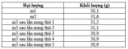 Lặp lại bước 3 và bước 4 cho đến khi khối lượng cân được ở bước 4 không đổi. Kết quả của nhóm học sinh thu được ở bảng bên.