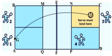 Pickleball là một môn thể thao đang ngày càng được phổ biến tại Việt Nam. Môn thể thao này là sự kết hợp của các môn tennis, bóng bàn và cầu lông, dù chỉ sử dụng một chiếc vợt nhỏ gọn và một quả bóng rỗng bằng nhựa. Sân Pickleball có kích thước tiêu chuẩn như hình vẽ bên với AB = 6,1 m; BC =13,41 m; BM = 4,57 m; ME = 2,13 m. Khi chơi Pickleball:
