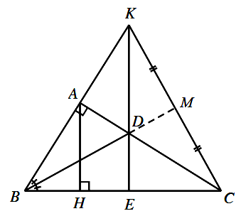 c) Chứng minh $BM$ là tia phân giác của $\angle KBC$, mặt khác tia $BD$ cũng là tia phân giác của $\angle ABC$ nên ba điểm $B,D,M$ thẳng hàng.
