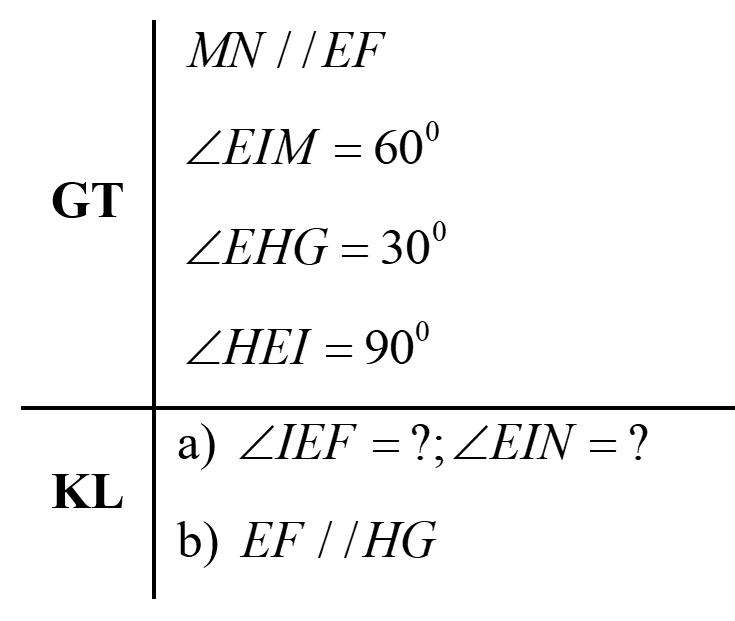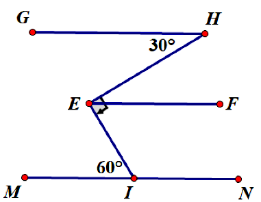 Cho hình vẽ biết $MN//EF,\angle EIM = 60^{0};\angle EHG = 30^{0}$ và $\angle HEI$ là góc vuông.