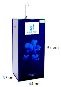 Một máy lọc nước có vỏ dạng hình hộp chữ nhật được làm bằng kính cường lực với