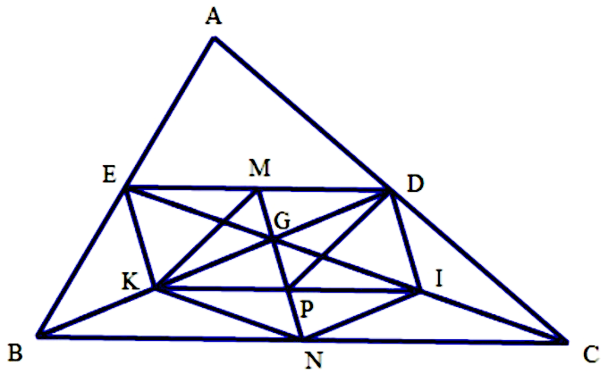 b) Gọi $\text{K},\text{I},\text{M},\text{N}$ lần lượt là trung điểm của $\text{BG},\text{CG},\text{DE},\text{BC}$. Chứng minh: KEDI là hình bình hành và $\text{M},\text{G},\text{N}$ thẳng hàng.