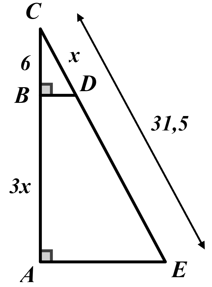 Cho tam giác ACE vuông tại $\text{A},\text{D}$ thuộc cạnh CE, kẻ DB vuông góc với AC tại B. Biết $CB = 6;CE = 31,5;AB = 3x;CD = x$. Tìm độ dài đoạn thẳng CD.