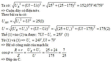 Trên đoạn mạch xoay chiều không phân nhánh có bốn điểm theo đúng thứ tự A, M, N và B. Giữa hai điểm A và M chỉ có điện trở thuần, giữa hai điểm M và N chỉ có cuộn dây, giữa 2 điểm N và B chỉ có tụ điện. Đặt vào hai đầu đoạn mạch một điện áp 175 V – 50 Hz thì điện áp hiệu dụng trên đoạn AM là 25 (V), trên đoạn MN là 25 (V) và trên đoạn NB là 175 (V). Hệ số công suất của toàn mạch là