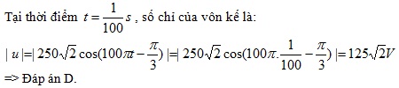 Một vôn kế nhiệt được mắc vào hai đầu một đoạn mạch để đo điện áp xoay chiều có biểu thức u = 250√2 cos(100πt – π/3) (V). Tại thời điểm t = 1/100 (s) , số chỉ của vôn kế là: