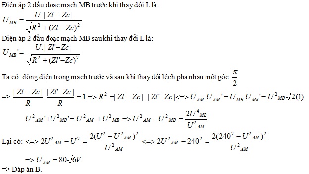 Đặt điện áp xoay chiều không đổi có giá trị hiệu dụng 240 V vào đoạn mạch AMB gồm đoạn AM chỉ chứa điện trở R, đoạn mạch MB chứa tụ điện có điện dung C mắc nối tiếp với một cuộn cảm thuần có độ tự cảm L thay đổi được. Biết sau khi thay đổi độ tự cảm L thì điện áp hiệu dụng hai đầu mạch MB tăng √2 lần và dòng điện trong mạch trước và sau khi thay đổi lệch pha nhau một góc π/2. Tìm điện áp hiệu dụng hai đầu mạch AM khi chưa thay đổi L?