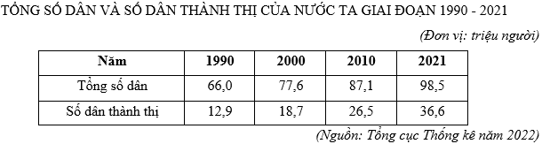 Dựa vào bảng số liệu trên, cho biết tỉ lệ dân thành thị của nước ta giai đoạn 1990 – 2021 tăng bao nhiêu %? (Kết quả lấy đến 1 chữ số sau dấu thập phân).