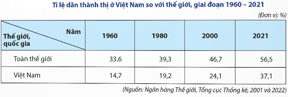 Dựa vào bảng số liệu, cho biết năm 2021, tỉ lệ dân thành thị của Việt Nam thấp hơn so với mức trung bình của thế giới bao nhiêu %? (Kết quả lấy đến 1 chữ số sau dấu thập phân).