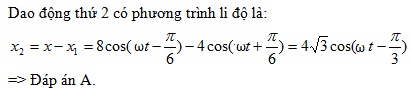 Dao động tổng hợp của hai dao động điều hòa cùng phương, cùng tần số có phương trình li độ x = 8 cos(ωt – π/6) cm. Biết dao động thứ nhất có phương trình li độ x1 = 4 cos(ωt + π/6) cm. Dao động thứ 2 có phương trình li độ là