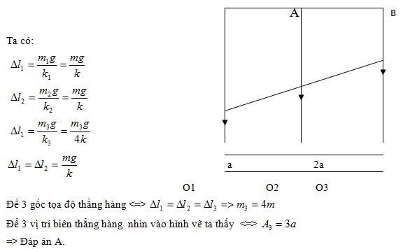 Có 3 lò xo cùng độ dài tự nhiên, có độ cứng lần lượt là k1 = k, k2 = 2k, k3 = 4k. Ba lò xo được treo cùng trên một mặt phẳng thẳng đứng tại 3 điểm A,B,C trên cùng đường thẳng nằm ngang với AB = BC. Lần lượt treo vào lò xo 1 và 2 các vật có khối lượng m1 = m và m2 = 2m, từ vị trí cân bằng nâng vật m1, m2 lên những đoạn A1 = a và A2 = 2a. Hỏi phải treo vật m3 ở lò xo thứ 3 có khối lượng bao nhiêu theo m và nâng vật m3 đến độ cao A3 bằng bao nhiêu theo a để khi đồng thời thả nhẹ cả ba vật thì trong quá trình dao động cả ba vật luôn thẳng hàng?