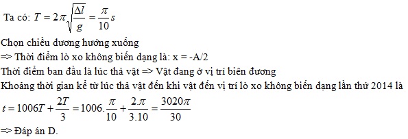 Một con lắc lò xo treo thẳng đứng, vật nặng có khối lượng m. Khi vật ở vị trí cân bằng lò xo giãn 2,5 cm. Người ta kéo vật đến vị trí lò xo giãn 7,5 cm rồi thả nhẹ. Lấy g = 10 m/s2 và π2 = 10. Khoảng thời gian kể từ lúc thả vật đến khi vật đến vị trí lò xo không biến dạng lần thứ 2014 là