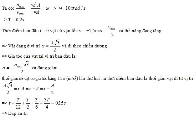 Một lò xo có độ cứng k nằm ngang, một đầu gắn cố định một đầu gắn vật khối lượng m. Kích thích để vật dao động điều hòa với vận tốc cực đại bằng 3m/s và gia tốc cực đại bằng 30 π (m/s2). Thời điểm ban đầu t = 0 vật có vận tốc v = +1,5m/s và thế năng đang tăng. Hỏi sau đó bao lâu vật có gia tốc bằng 15 π (m/s2) lần thứ hai.