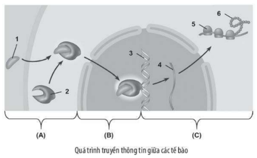 Sơ đồ sau đây mô tả cho quá trình truyền thông tin giữa các tế bào. Hãy chú thích các thành phần được đánh số từ 1 đến 6. Nêu tên các giai đoạn (A), (B), (C) và trình bày cơ chế của mỗi giai đoạn đó.