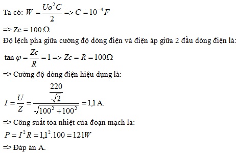 Đặt một điện áp không đổi bằng 220V vào hai đầu đoạn mạch gồm một điện trở thuần mắc nối tiếp với tụ điện thì năng lượng của tụ điện là 2420 mJ. Đặt điện áp xoay chiều u = 220cos100t (V) vào hai đầu đoạn mạch thì cường độ dòng điện lệch pha π/4 so với điện áp hai đầu đoạn mạch. Khi đó, công suất tỏa nhiệt của đoạn mạch là bao nhiêu?