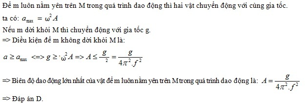 Hệ gồm vật m nằm trên vật M (mặt tiếp xúc giữa 2 vật là phẳng và nằm ngang) dao động điều hoà theo phương thẳng đứng với tần số f và biên độ A. Để vật m luôn nằm yên trên vật M trong quá trình dao động thì biên độ dao động lớn nhất là