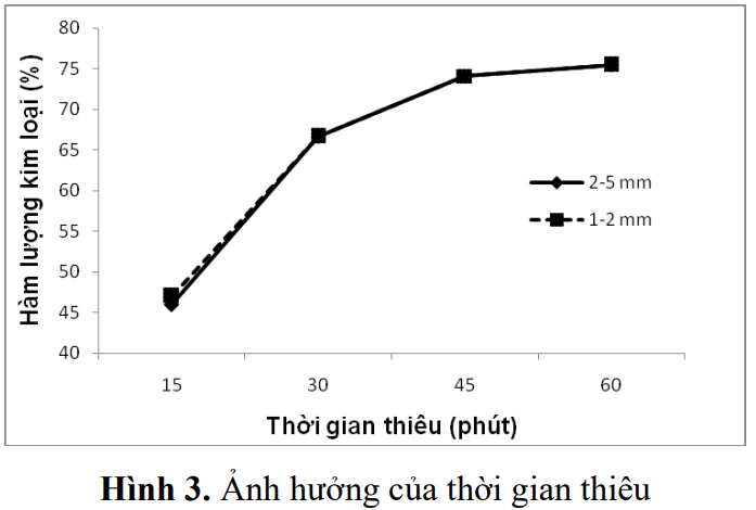 Để xem xét ảnh hưởng của thời gian thiêu, các mẫu phế liệu được thiêu ở nhiệt độ 750ºC với thời gian thay đổi từ 15 tới 60 phút, các kết quả thu được trình bày trên hình 3