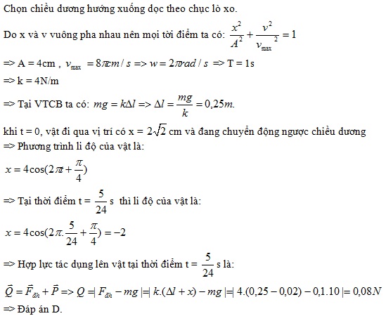 Một vật có khối lượng m = 100g chuyển động thẳng có hệ thức giữa vận tốc và tọa độ là v2/640 + x2/16 = 1, với x tính bằng cm và v tính bằng cm/s. Biết rằng khi t = 0, vật đi qua vị trí có x = 2√2cm và đang chuyển động ngược chiều dương. Lấy π2 = 10. Hợp lực tác dụng lên vật tại thời điểm t = 5/24 (s) là: