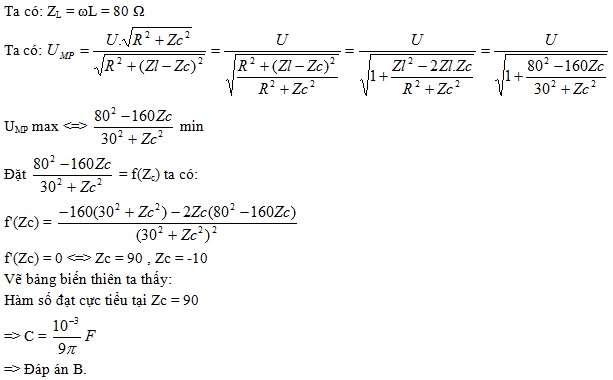 Cho đoạn mạch xoay chiều MN gồm hai đoạn mạch mắc nối tiếp: Đoạn MP gồm điện trở thuần R = 30 Ω mắc nối tiếp với tụ điện có điện dung C, đoạn PN chỉ có cuộn cảm thuần với độ tự cảm L = 0,8/π (H). Điện áp đặt vào hai đầu đoạn mạch có biểu thức u = U√2cos100πt (V).Để điện áp hiệu dụng UMP đạt cực đại thì điện dung của tụ bằng bao nhiêu?