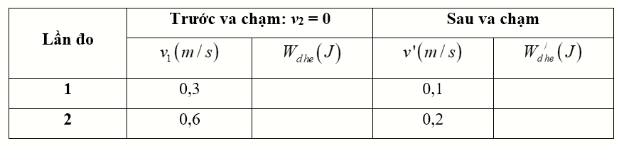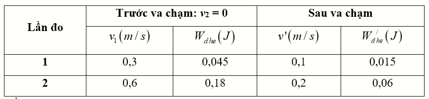 c) Một học sinh làm thí nghiệm cho vật 1 khối lượng 1 kg đến va chạm vào vật 2 có khối lượng 2 kg. Sau va chạm 2 vật dính vào nhau và chuyển động với cùng vận tốc $v'$. Dựa vào bảng số liệu, em hãy tính động năng của hệ trước và sau va chạm. Từ đó rút ra nhận xét về sự thay đổi về động năng của hệ trước và sau va chạm.