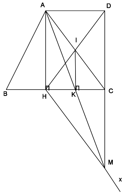 2) Từ H vẽ tia Hx song song với AC và cắt tia DC tại M. Kẻ IK vuông góc với HC (K thuộc HC). Chứng minh ba điểm $\text{A},\text{K},\text{M}$ thẳng hàng.