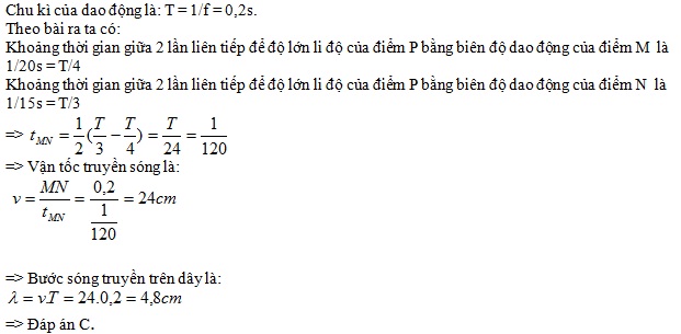 Sóng dừng xuất hiện trên một sợi dây với tần số 5 Hz. Gọi thứ tự các điểm thuộc dây lần lượt là O, M, N, P sao cho O là điểm nút, P là điểm bụng sóng gần O nhất (M, N thuộc đoạn OP). Khoảng thời gian giữa 2 lần liên tiếp để độ lớn li độ của điểm P bằng biên độ dao động của điểm M và N lần lượt là 1/20 (s) và 1/15 (s). Biết khoảng cách giữa 2 điểm M và N là 0,2 cm. Sóng truyền trên dây có bước sóng gần giá trị nào nhất?