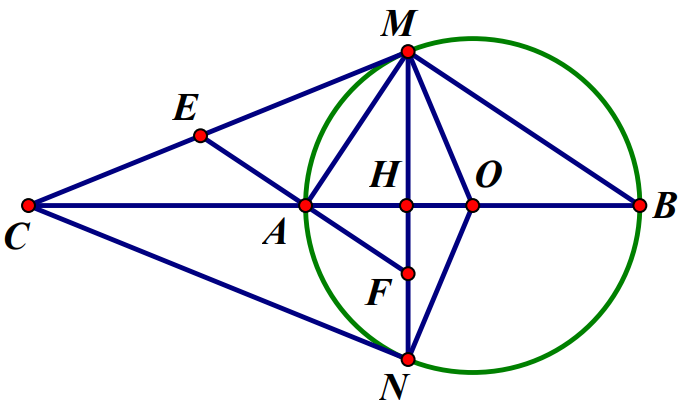 Cho đường tròn tâm O đường kính AB. Trên tia đối của tia AB lấy điểm C. Kẻ $\text{CM},\text{CN}$ là các tiếp tuyến của $\left( \text{O} \right)(\text{M},\text{N}$ là các tiếp điểm). CO cắt MN tại H. Qua A kẻ đường thẳng song song với BM cắt CM tại E, cắt MN tại F.