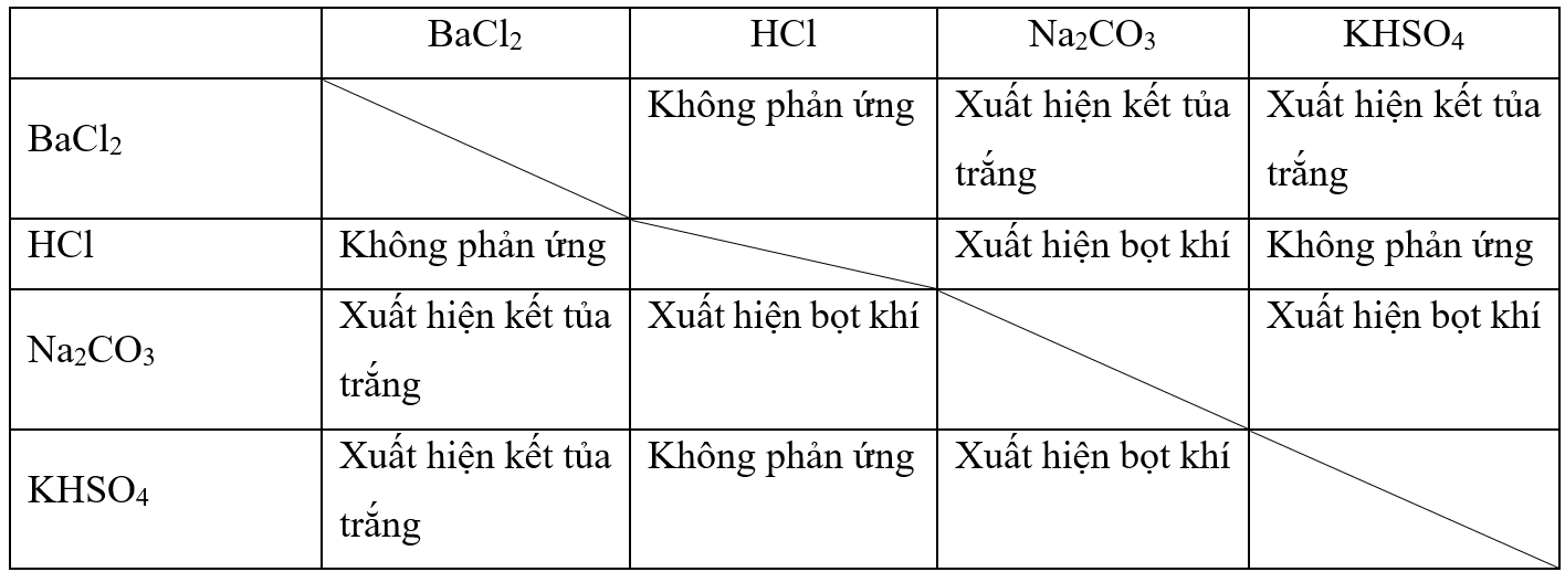 - Thứ phản ứng của bốn hoá chất với nhau: