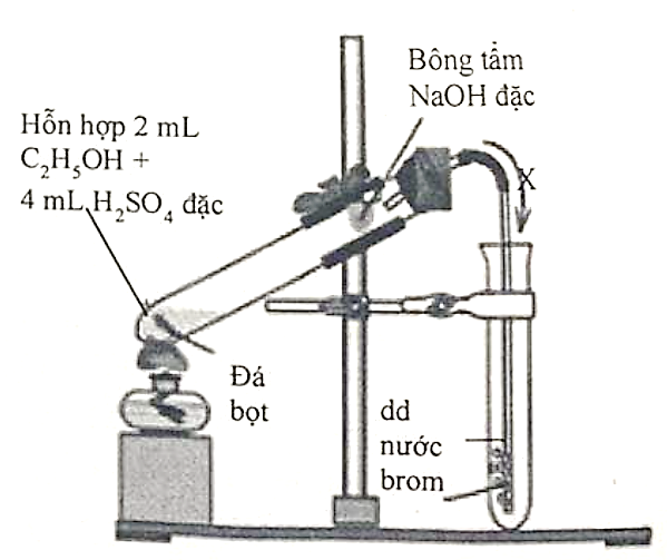 a) Giải thích vì sao quá trình điều chế X từ hỗn hợp ethylic alcohol và H2SO4 đặc thường có kèm sản phẩm phụ là CO2 và SO2. Nêu vai trò của bông tẩm NaOH đặc ở hình bên. Viết phương trình hóa học của các phản ứng xảy ra.