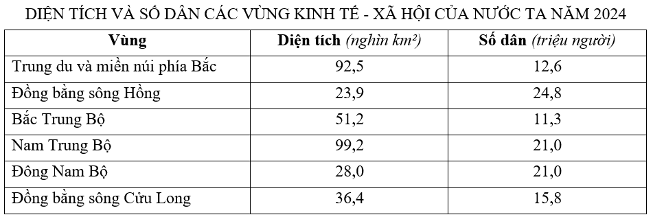 Căn cứ vào bảng số liệu trên, hãy cho biết vùng kinh tế - xã hội nào mật độ dân số thấp nhất cả nước năm 2024?