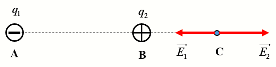 Tại hai điểm A, B cách nhau 15 cm trong không khí có hai điện tích $q_{1} = - 12.10^{- 6}C;q_{2} = 3.10^{- 6}C.~$ Xác định độ lớn cường độ điện trường do hai điện tích này gây ra tại điểm C. Biết $AC = 20cm,BC = 5cm$.