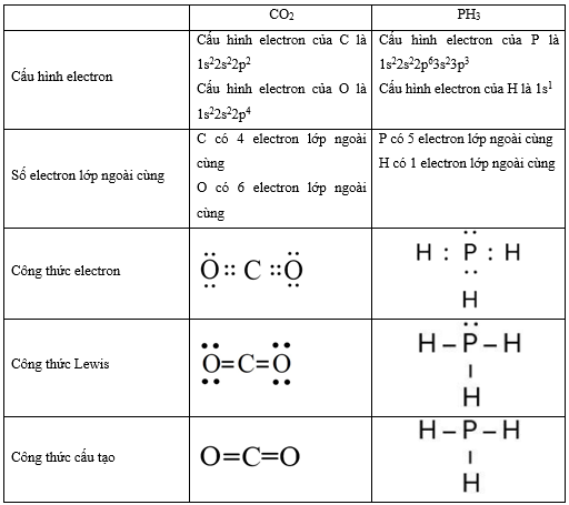 Viết công thức electron, công thức Lewis và công thức cấu tạo của các phân tử: PH3 và CO2.