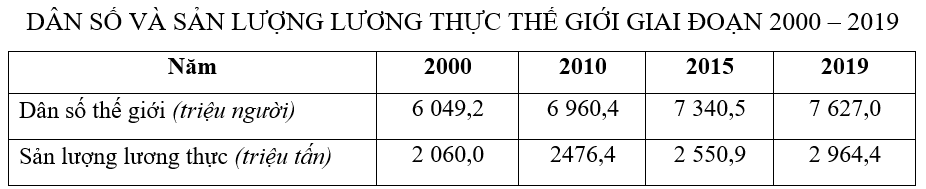 Theo bảng số liệu, để thể hiện tốc độ tăng trưởng dân số và sản lượng lương thực thế giới giai đoạn 2000 – 2019, biểu đồ nào sau đây thích hợp nhất?