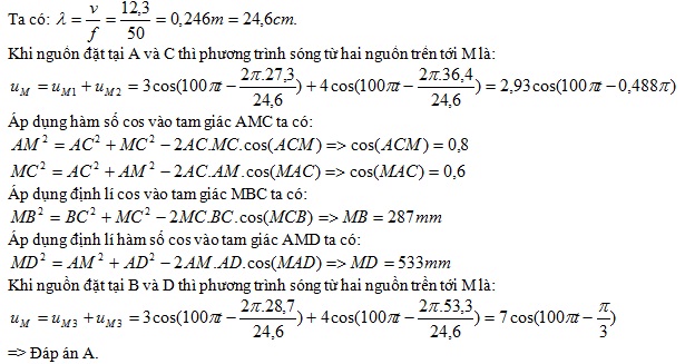 Tại mặt chất lỏng có 4 điểm thẳng hàng được sắp xếp theo thứ tự A,B,C,D với AB = 350 mm; BC = 105 mm, CD = 195 mm. Điểm M thuộc mặt chất lỏng cách A và C tương ứng là MA = 273 mm; MC = 364 mm. Hai nguồn dao động theo phương vuông góc với mặt nước với phương trình: u1 = 3cos100πt (cm); u2 = 4cos100πt (cm). Biết vận tốc truyền sóng trên mặt chất lỏng bằng 12,3 m/s. Coi biên độ sóng do các nguồn tới M bằng biên độ sóng của mỗi nguồn. Khi hai nguồn sóng đặt ở A và C thì các phần tử chất lỏng tại M dao động với biên độ A1, khi hai nguồn sóng đặt ở B và D thì các phần tử chất lỏng tại M dao động với biên độ A2. Giá trị của A1 và A2 tương ứng là