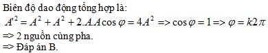 Hai dao động điều hoà cùng phương, cùng tần số và cùng biên độ A. Dao động tổng hợp của hai dao động này có biên độ bằng 2A khi dao động đó