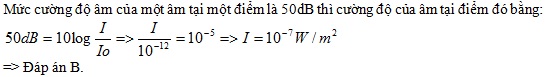 Biết cường độ âm chuẩn cuae một âm là 10-12W/m2 . Mức cường độ âm của một âm tại một điểm là 50dB thì cường độ của âm tại điểm đó bằng
