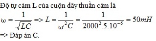 Dòng điện tức thời trong mạch dao động điện từ LC là i = I0sin2000t (I0 không đổi, t tính bằng giây). Tụ điện có điện dung C = 5μF. Độ tự cảm L của cuộn dây thuần cảm là