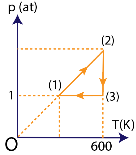 | c) Các thông số của khối khí ở trạng thái 2 là $p_{2} = 2\,\, at;\,\, V_{2} = 6\,\, lit;\,\, T_{2} = 300\,\, K$. | ||