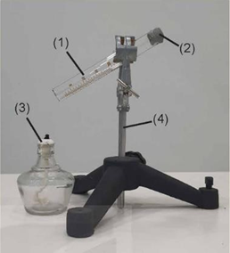 Một nhóm học sinh đã chuẩn bị các dụng cụ: Ống nghiệm (1), nút bấc có kích thước vừa khít với miệng ống nghiệm (2), đèn cồn (3), giá đỡ thí nghiệm (4) và các điều kiện cần thiết khác để làm thí nghiệm tìm hiểu về mối liên hệ giữa nội năng của một khối khí với năng lượng của các phân tử khí. Bố trí thí nghiệm như hình bên, sau đó dùng đèn cồn hơ nóng ống nghiệm cho đến khi nút bấc bật ra khỏi miệng ống nghiệm.